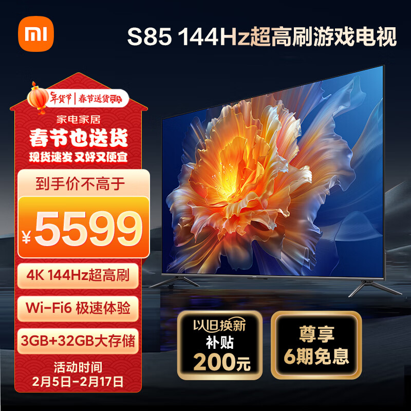 小米电视S85 85英寸4K 144Hz超高刷全速旗舰游戏电视 WiFi 6 3GB+32GB智能电视L85MA-S以旧换新价格:5599.00元!