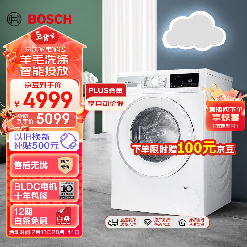 博世(BOSCH)【云朵白】10公斤全自动家用滚筒洗衣机洗烘一体机 i-Dos系统 绿标羊毛护理 XQG100-WNE152A0AW价格:5099.00元!