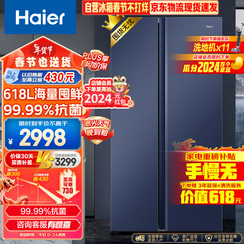 海尔(Haier)618升风冷无霜对开门双开门电冰箱家用一级能效变频节能净味超薄嵌入超大容量BCD-618WGHSSEDBL价格:2998.00元!