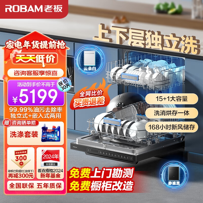 老板(Robam)F80D黑【大天空】洗碗机15套嵌入式去重油污热风烘干消杀168h长效存储一体机家用独立式分层洗价格:5199.00元!