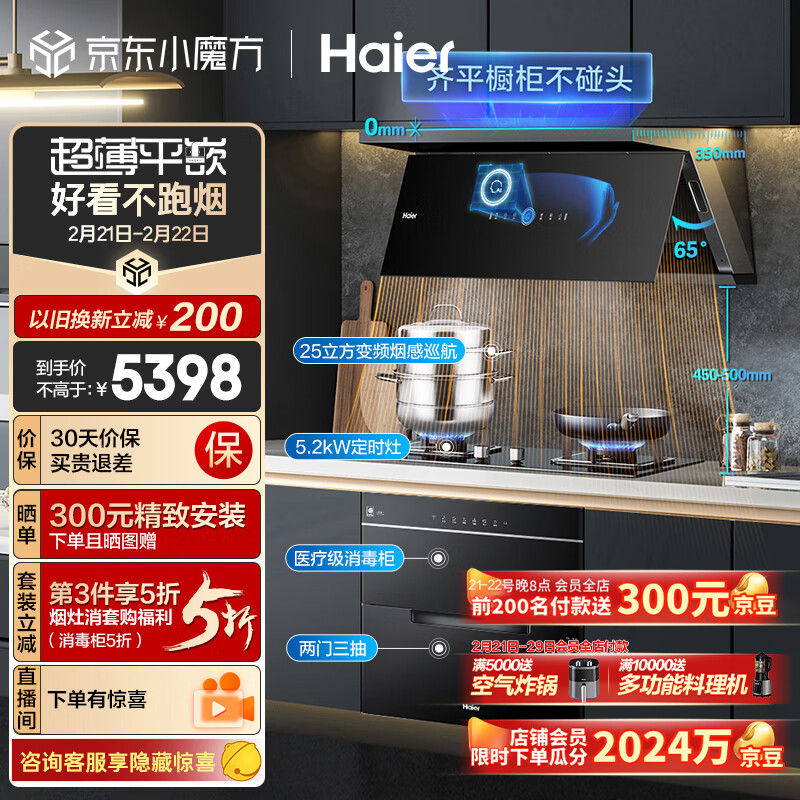 海尔(Haier)平嵌大师系列 烟灶消三件套 25m3/min变频有效风 5.2KW定时灶 医疗级消毒C21U1+Q2BE7天+E07JU1价格:5398.00元!