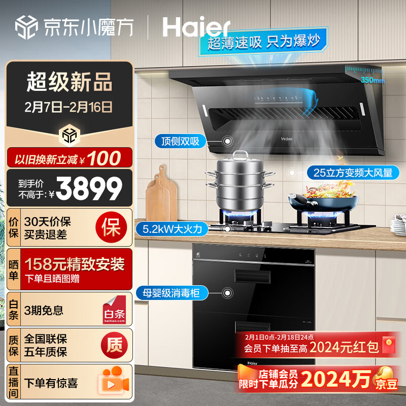 海尔(Haier)抽油烟机 顶侧双吸油烟机燃气灶消毒柜三件套 25m3/min大吸力 烟灶消套装C61+Q2BE3天+12LCS1价格:3899.00元!