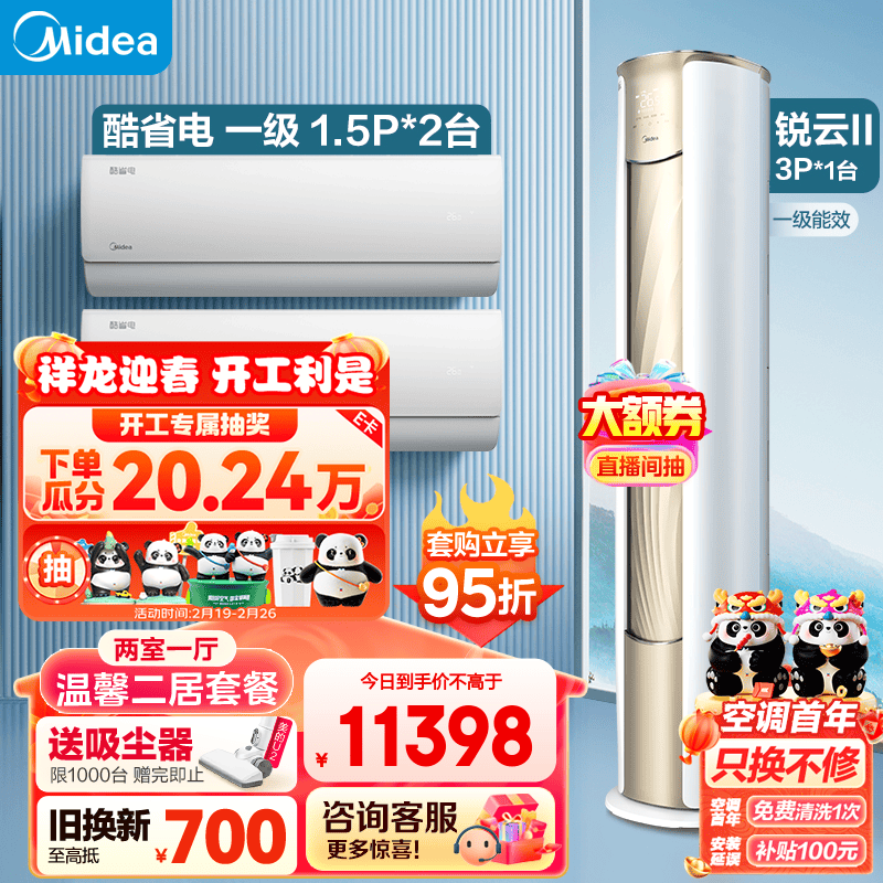 美的(Midea)温馨二居套餐 套购一站式 锐云2代空调套装 (1.5匹酷省电一级*2+3匹锐云)价格:11997.00元!