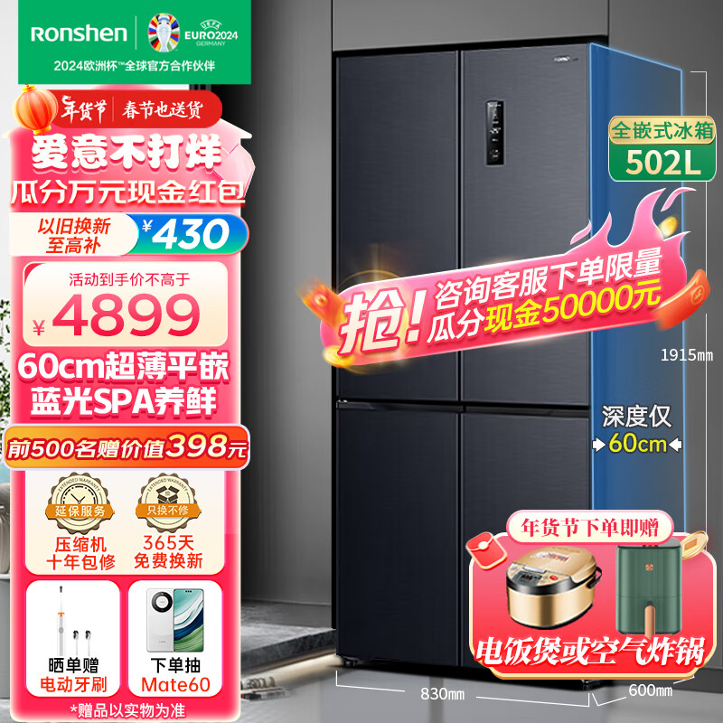 容声冰箱502升十字双开四开门家用大容量超薄零距离嵌入式一级变频底部散热无霜冰箱BCD-502WD1FPQ价格:5399.00元!