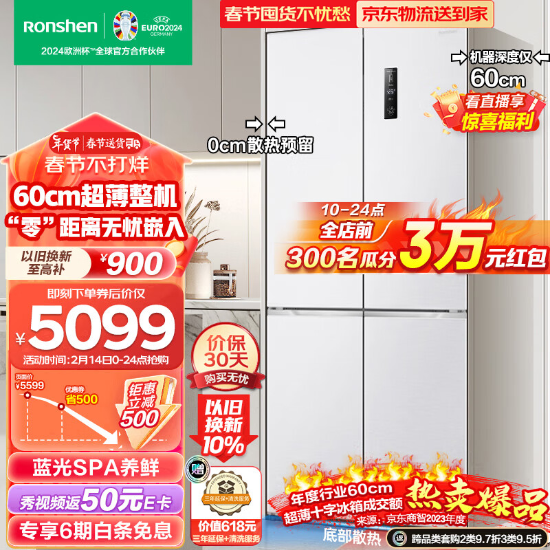 容声(Ronshen)60厘米薄503升十字对开四开门超薄嵌入式冰箱家用变频一级能效大容量底部散热BCD-503WD1FPQ白色价格:5599.00元!
