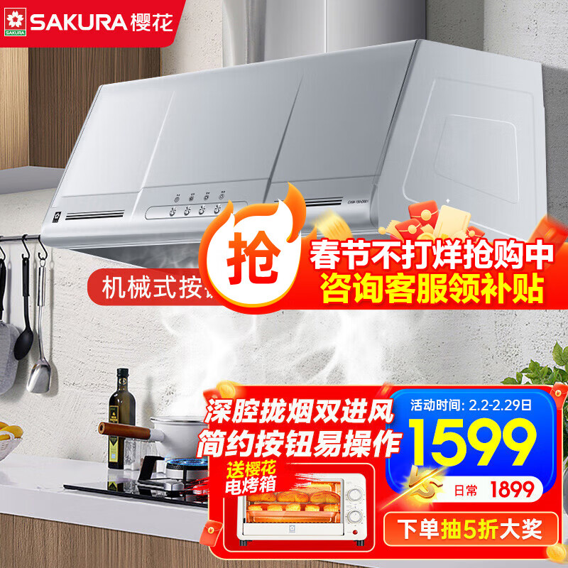 樱花(SAKURA)抽油烟机750mm家用小尺寸双电机大吸力 中式油烟机 厨房顶吸式老式脱排壁挂式每年送油网 CXW-150-D001价格:1599.00元!