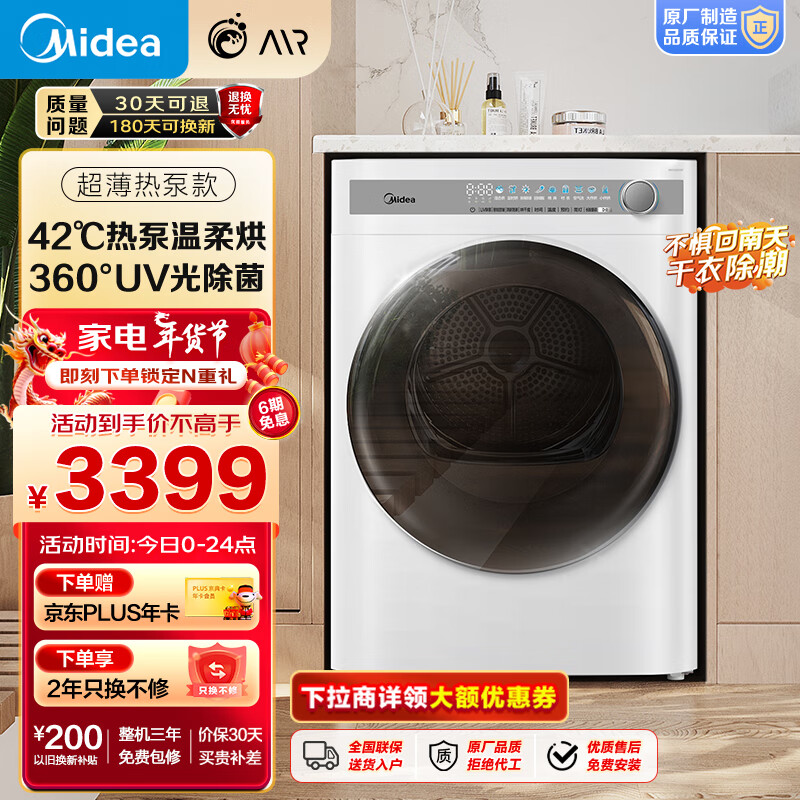 美的(Midea)10公斤 热泵烘干机 干衣机家用 除菌除螨除潮 白色 毛屑过滤 MH100AIR1价格:3399.00元!