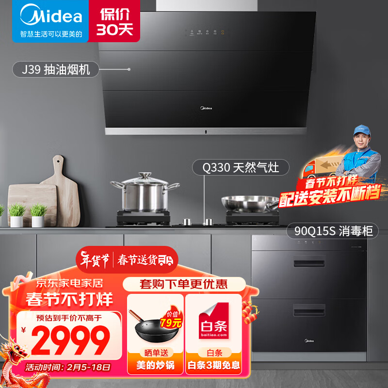 美的(Midea)烟灶消三件套侧吸智能干洗抽油烟机5.0KW火力燃气灶100L消毒柜J39+Q330+90Q15S(天然气)价格:2999.00元!