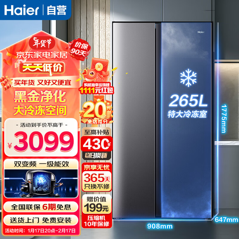 海尔(Haier)冰箱双开门 515升一级能效双变频风冷无霜对开门两门多门电冰箱超薄大冷冻省电家用大容量价格:3099.00元!