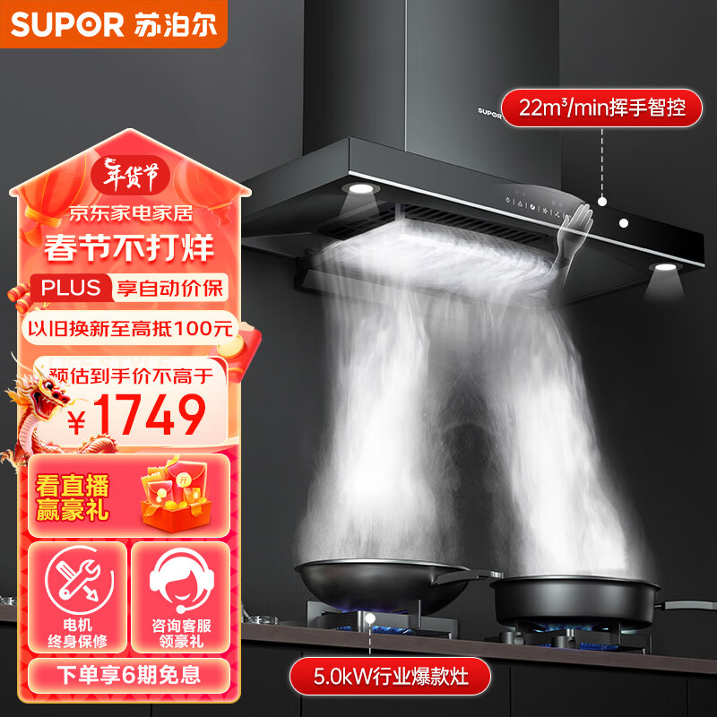 苏泊尔(SUPOR) 抽油烟机 烟灶套装22立方家用欧式吸油烟机燃气灶具套装挥手智控 自清洁 DT32+Q5液价格:1849.00元!