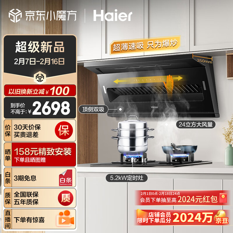 海尔(Haier)抽油烟机 顶侧双吸烟灶套装 24m3/min大吸力 5.2kw定时灶 家用油烟机燃气灶具套装C51+Q2BE7天价格:2698.00元!