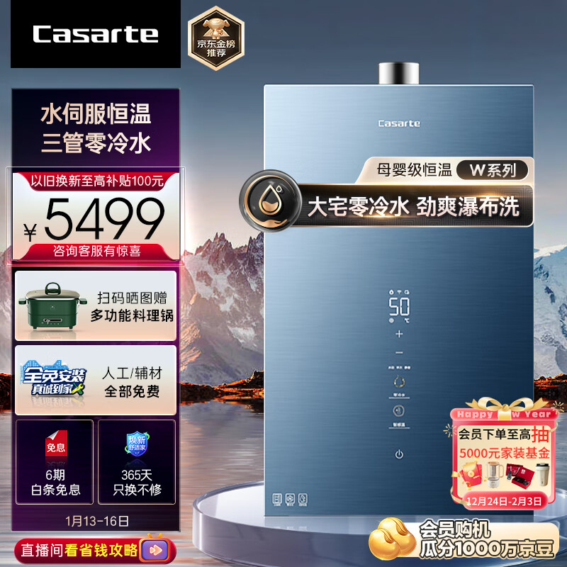 卡萨帝(Casarte)鉴赏家16升家用燃气热水器天然气母婴级恒温三管零冷水静音水伺服增压下置风机JSQ31-16CWS(12T)U1价格:5499.00元!