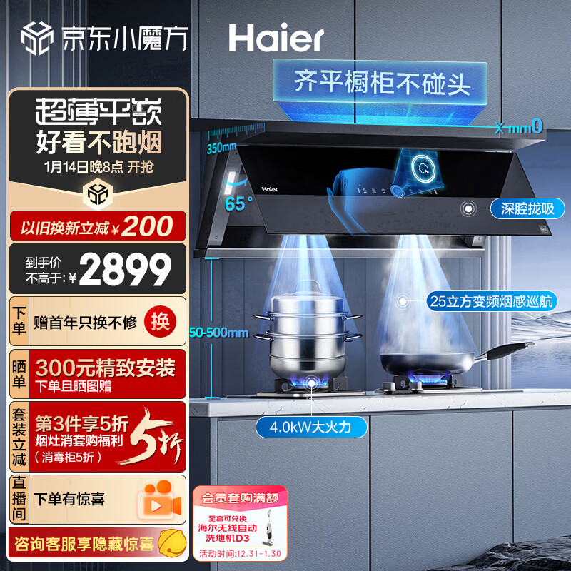 海尔(Haier)抽油烟机 超薄近吸烟灶套装 25m3/min变频有效风 顶侧双吸外观 家用吸油烟机燃气灶具C21U1+5B0液价格:2899.00元!
