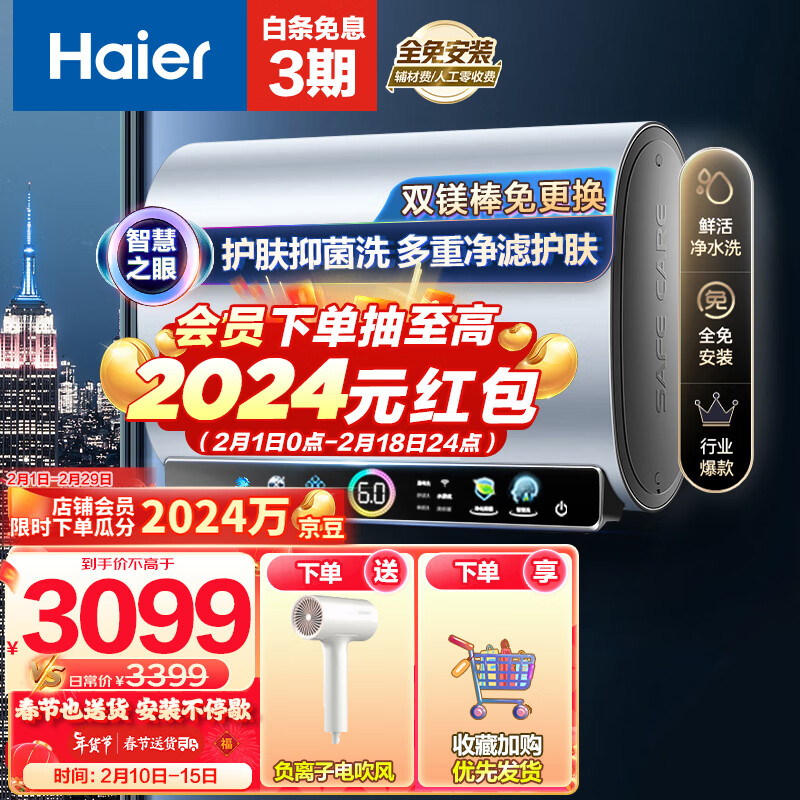 海尔(Haier)80升家用扁桶全隐藏式安装电热水器双3000W速热双胆双镁棒免换EC8003-BOOKU1 【以旧换新】价格:3399.00元!