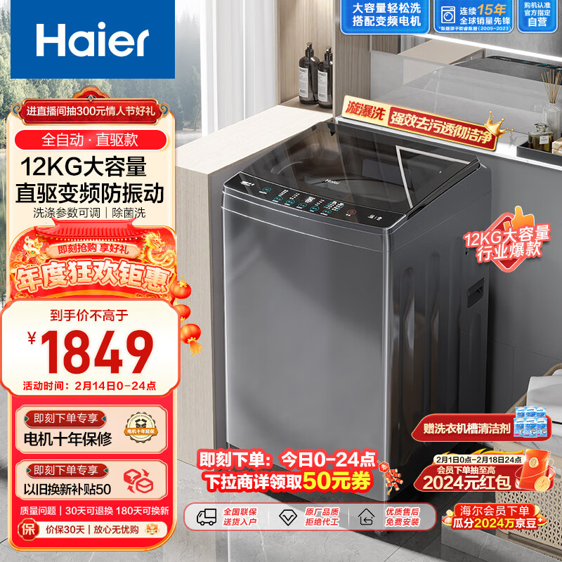 海尔(Haier)波轮洗衣机全自动 12公斤大容量 漩瀑洗高洁净 直驱变频 电离除菌 羽绒洗 以旧换新EB120B35Mate3价格:1899.00元!