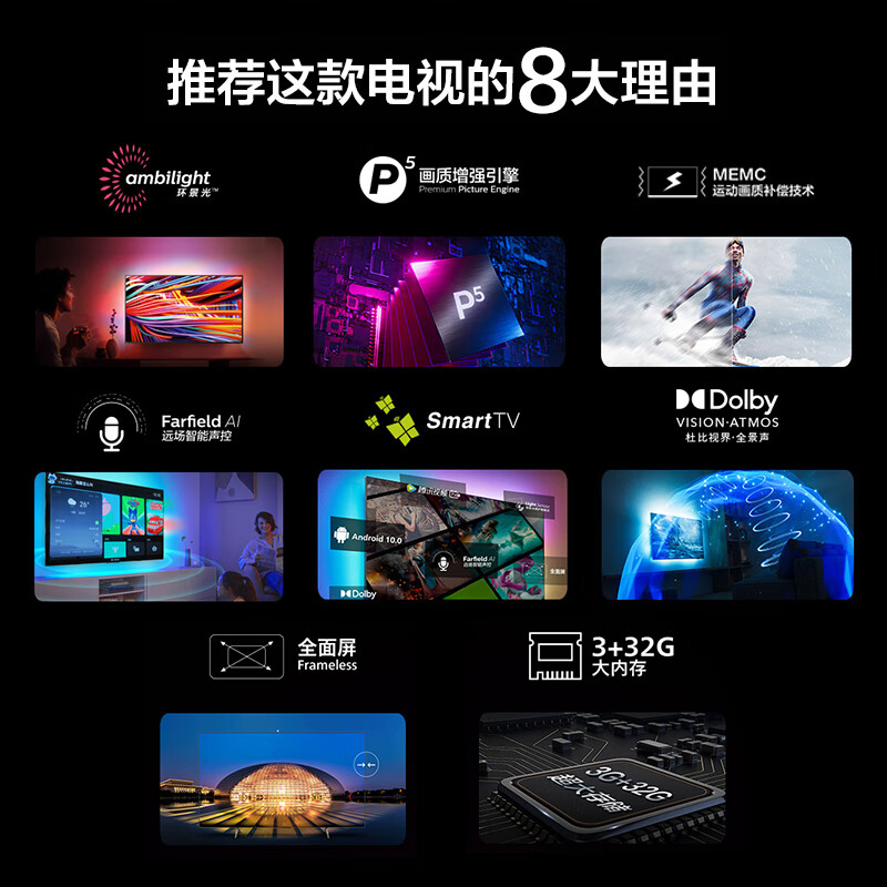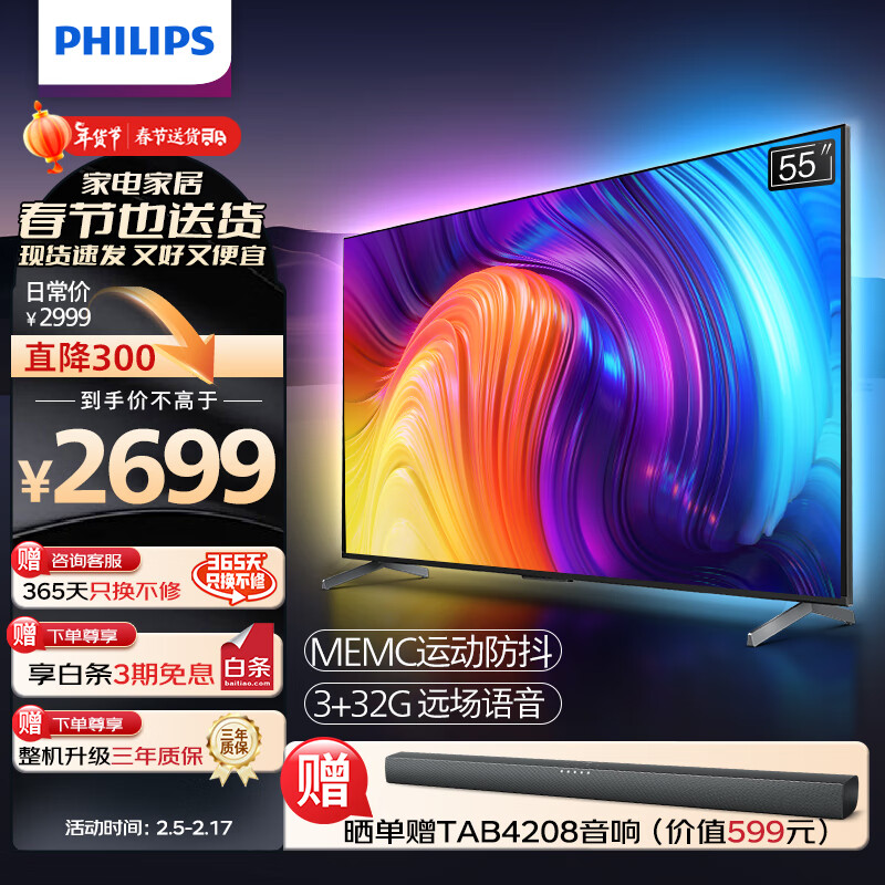 飞利浦(PHILIPS)55英寸4K超高清 3+32G环景光 艺术电视远场语音 网络智能投屏液晶平板电视机55PUF8297/T3以旧换新价格:2699.00元!