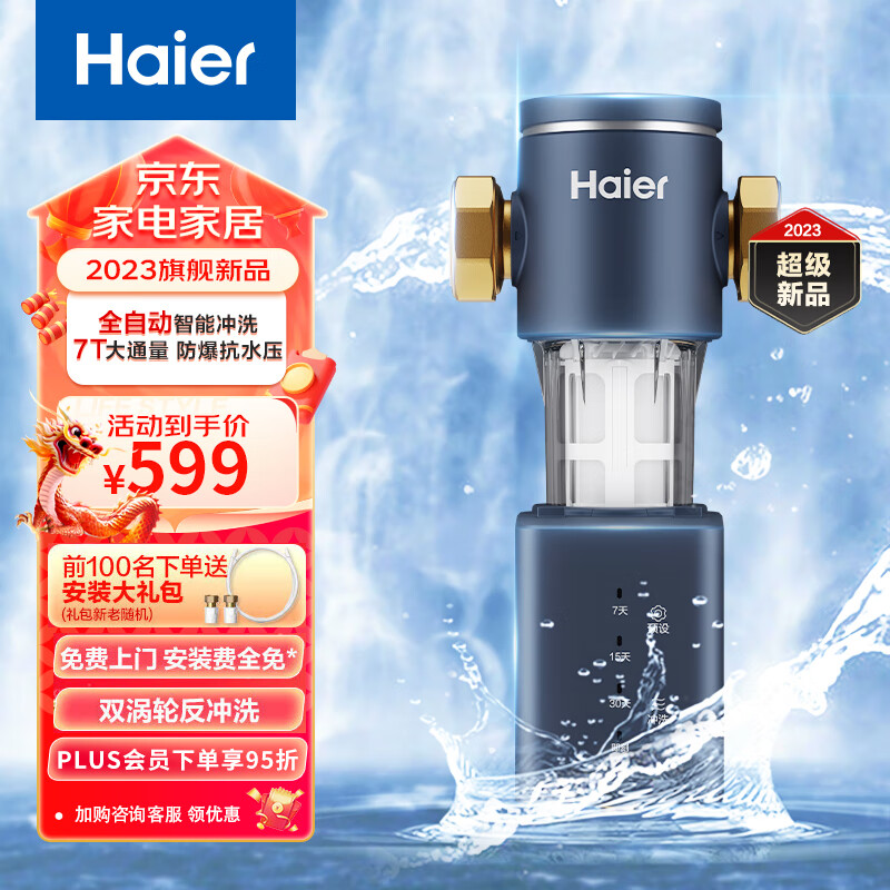 海尔前置过滤器7T大通量家用智能净水器40微米自动反冲洗精滤实时水压监测全屋净水机HQZ50-XFAZ08价格:599.00元!