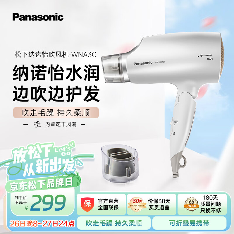 松下(Panasonic)电吹风机大功率高速大风力速干折叠便携 家用纳诺怡水润护发电吹风筒老婆女友EH-WNA3C价格:349.00元!