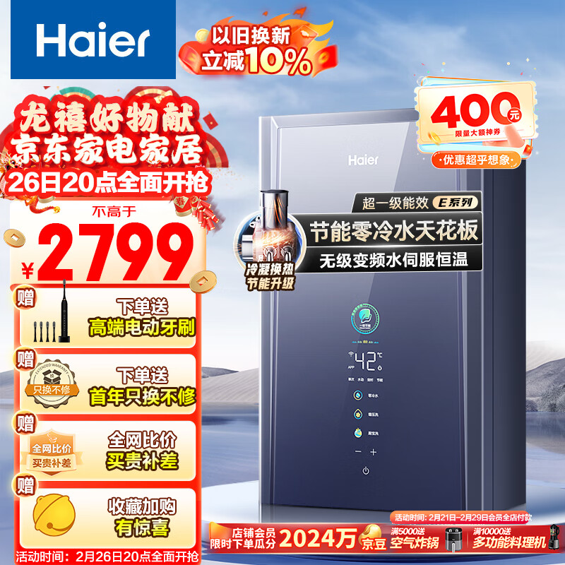 海尔(Haier)16升燃气热水器天然气超一级能效零冷水TSI增压大水量无级变频水伺服恒温家用 JSLQ27-16ER7DLPGU1价格:3199.00元!