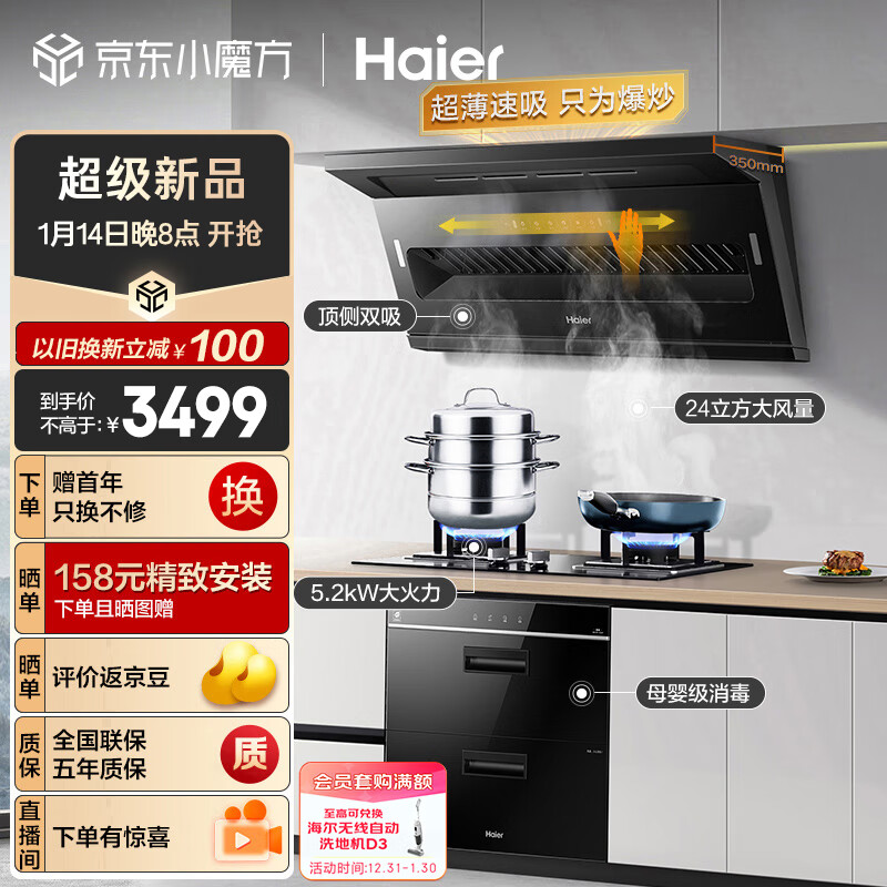 海尔(Haier)抽油烟机 顶侧双吸油烟机燃气灶消毒柜三件套 24m3/min大吸力 烟灶消套装C51+Q2BE3天+12LCS1价格:3499.00元!