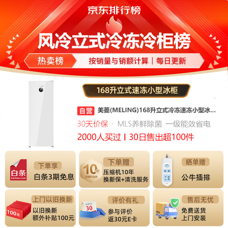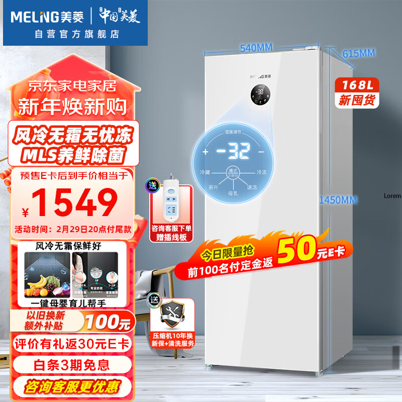 美菱(MELING)168升立式冷冻速冻小型冰柜 家用客厅分区抽屉母婴母乳冷柜风冷无霜一级能效 BD-168WEC白价格:1598.00元!