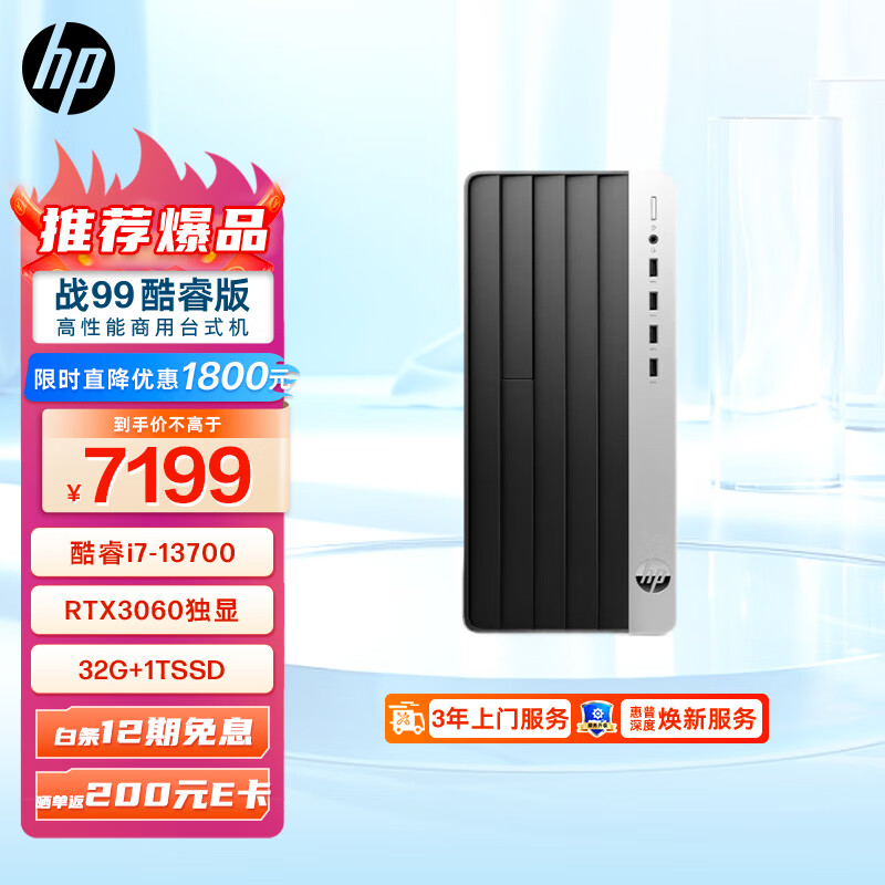 惠普(HP)战99台式电脑主机大机箱 16核高性能整机 台式机教育学习 图形设计(13代i7-13700 32G 1T RTX3060)价格:7199.00元!