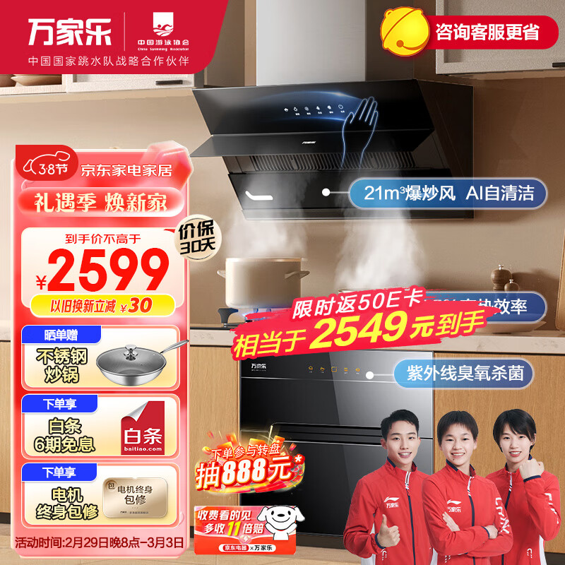 万家乐 抽油烟机侧吸自清洗21m3/min挥手智控5.0kW燃气灶110L消毒柜烟灶消三件套AJ4+KV061B+DQ052天然气价格:2799.00元!