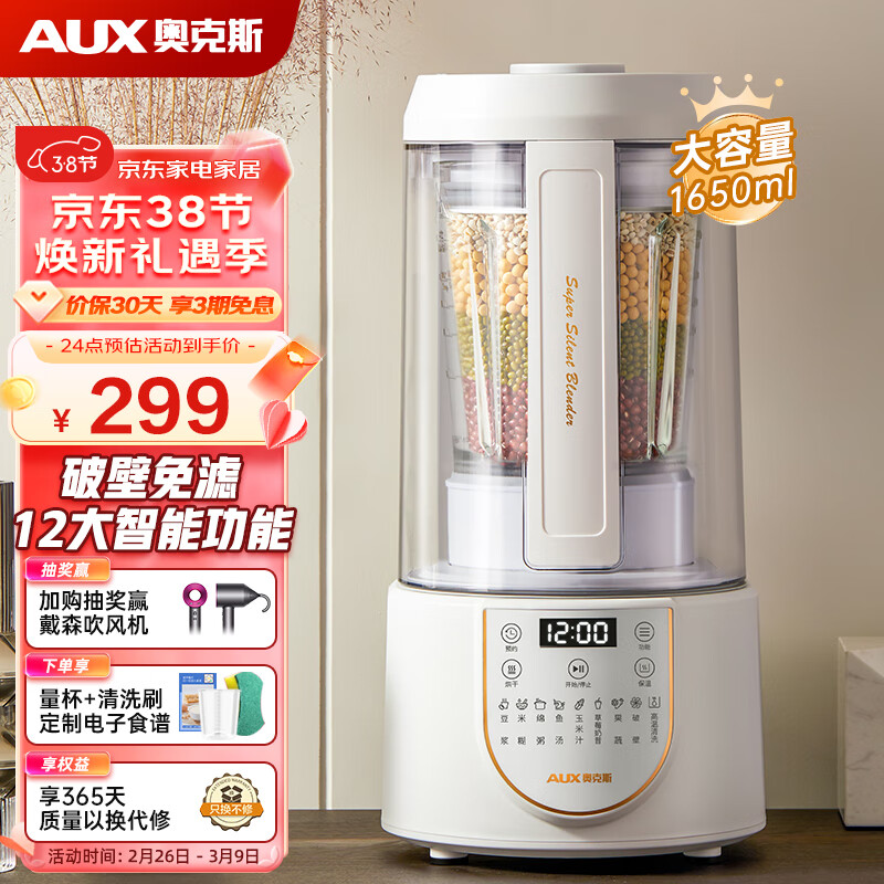 奥克斯(AUX) 破壁机家用安睡柔音舱 免滤豆浆机预约防糊底多功能榨汁机辅食机料理机 PB9718Z 朝露白-1.65升价格:299.00元!