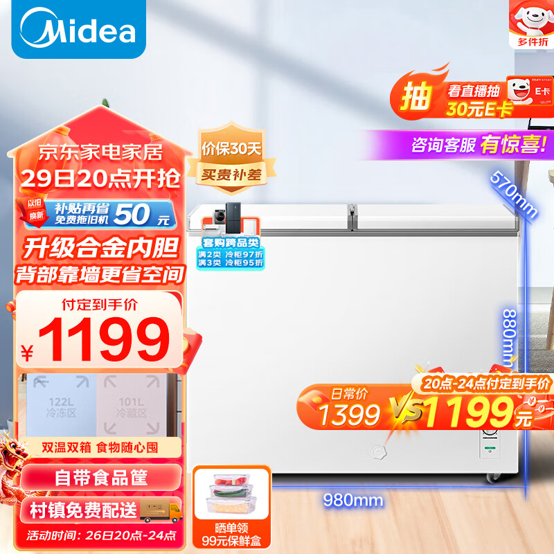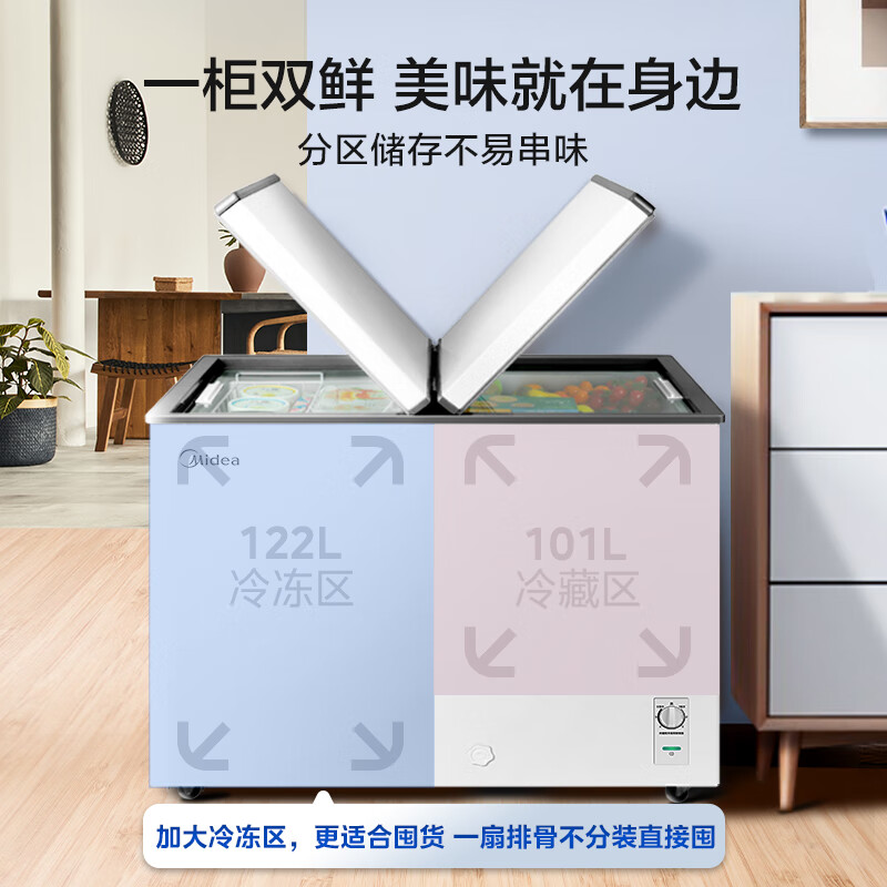 美的(Midea)223升家用商用囤货双温双箱冰柜 蝶形门卧式冷藏冷冻冰柜 家用小型冰箱冷柜 BCD-223VM(E)价格:1299.00元!