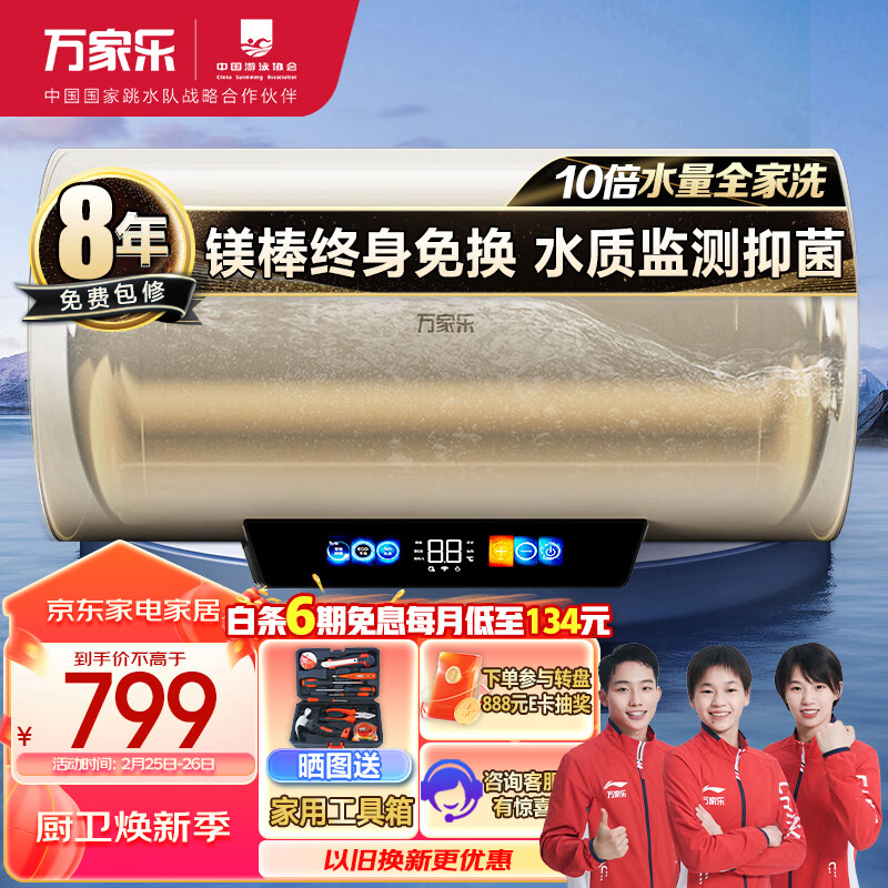 万家乐60升电热水器智能巡航水质监测杀菌 镁棒免换 3000W速热 一级能效 10倍大水量D60-FD5价格:899.00元!