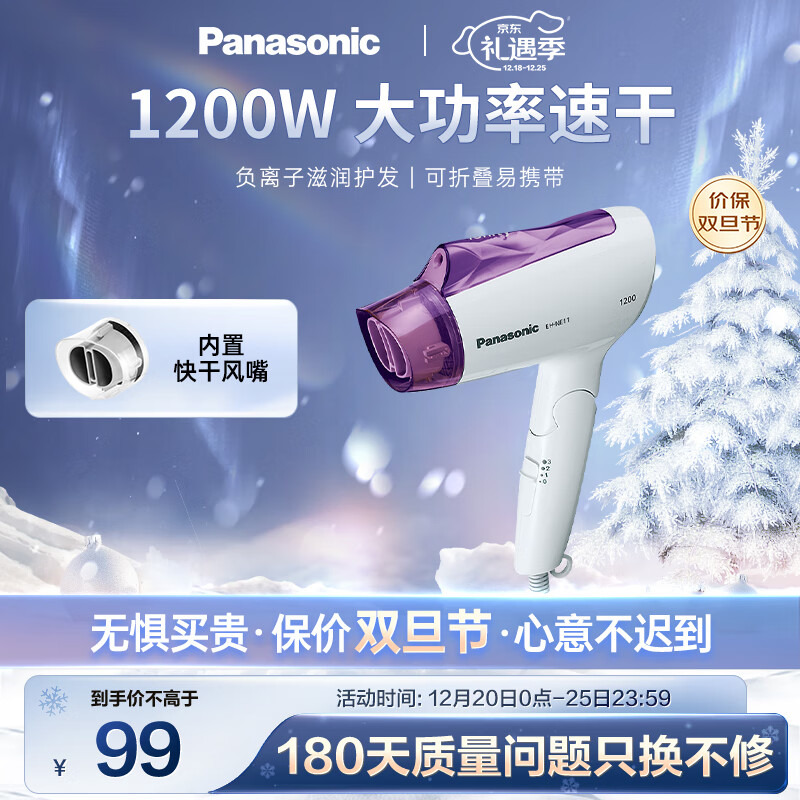 松下(Panasonic)电吹风机大功率高速大风力速干折叠便携 送老婆女友负离子吹发护发电吹风筒EH-NE11-V价格:99.00元!