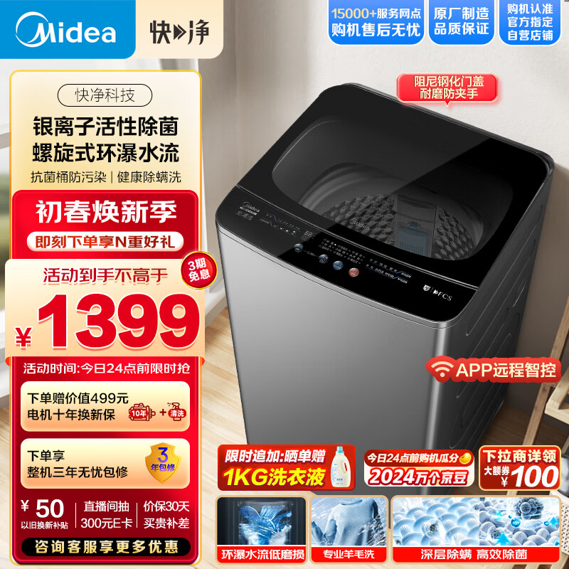 美的(Midea)波轮洗衣机全自动 快净系列 10公斤 环瀑水流低磨损 健康除螨 远程智控 专利免清洗 MB100V51Y价格:1399.00元!