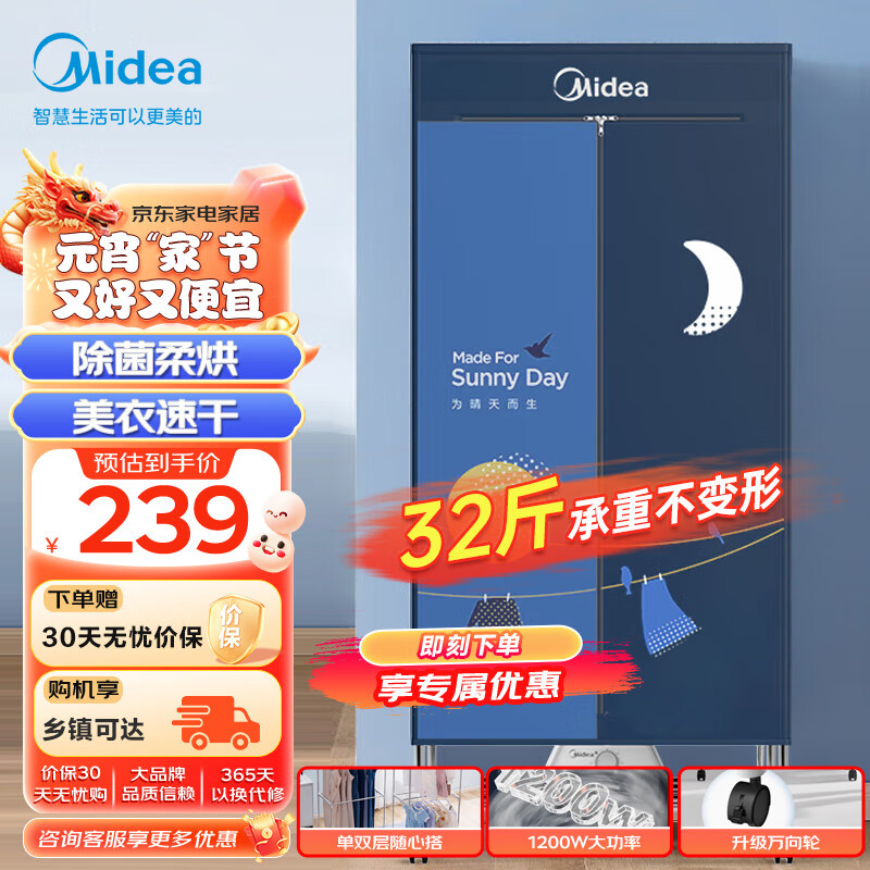 美的(Midea)烘干机家用小型干衣机婴儿衣物暖风烘衣机风干机30斤双层大容量定时烘干小型衣物护理机HBG-JQ3价格:239.00元!