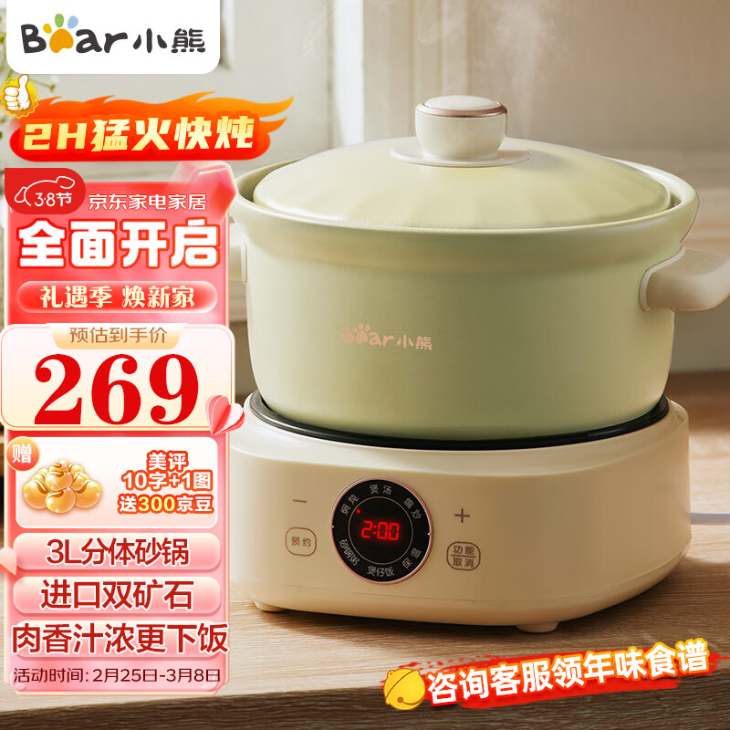 小熊(Bear)电砂锅 电炖锅 煲汤锅 炖汤锅 电炖盅 焖炖锅 养生煮粥锅煲仔饭快炖分体式电砂锅DSG-D30S1 3L价格:269.00元!