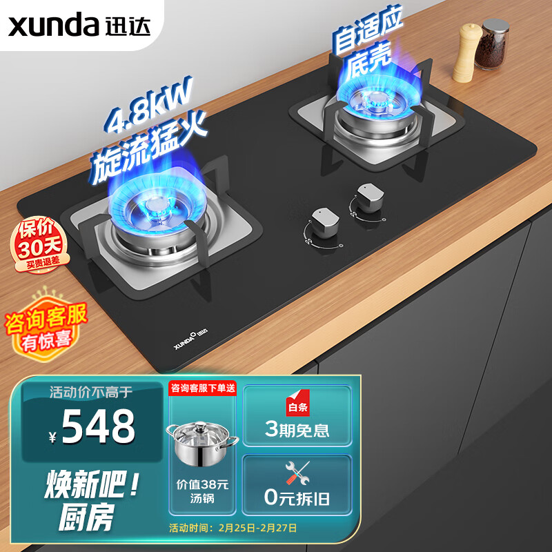 迅达(XUNDA)燃气灶天然气灶家用 双灶具灶台 嵌入式台式两用 4.8KW旋流猛火灶 钢化玻璃面板 Q2-天然气价格:598.00元!