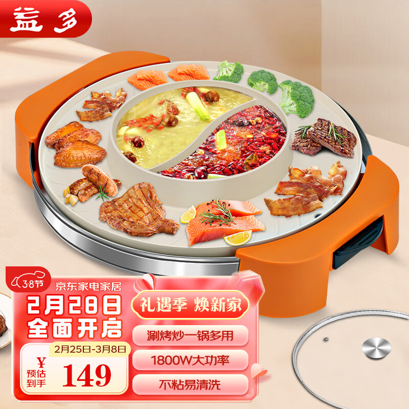 益多多功能涮烤一体锅家用插电烧烤炉麦饭石不粘烤肉锅鸳鸯锅电热火锅 SS-46A价格:149.00元!
