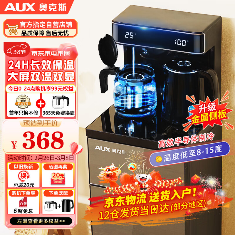 奥克斯(AUX)家用茶吧机大屏下置水桶饮水机 双温双显双出水口 立式智能遥控茶吧机冷热款YCB-0.75-58价格:368.00元!