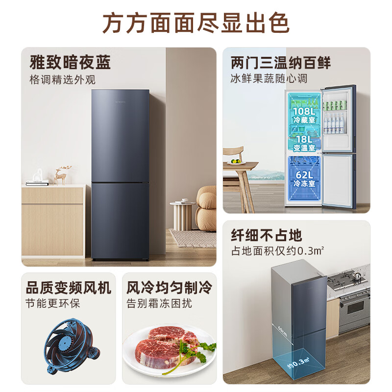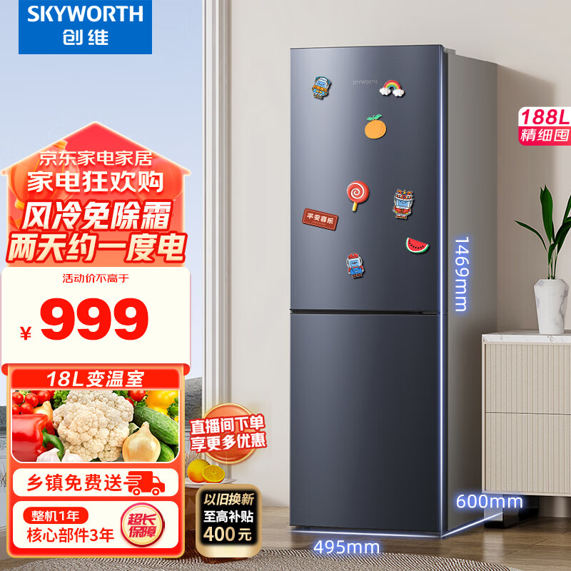 创维(SKYWORTH)188升双门小型冰箱 风冷无霜两门家用电冰箱 电脑控温 节能低音租房公寓宿舍P18WY价格:999.00元!