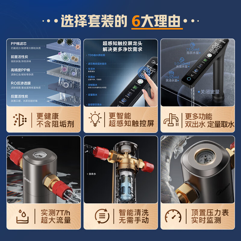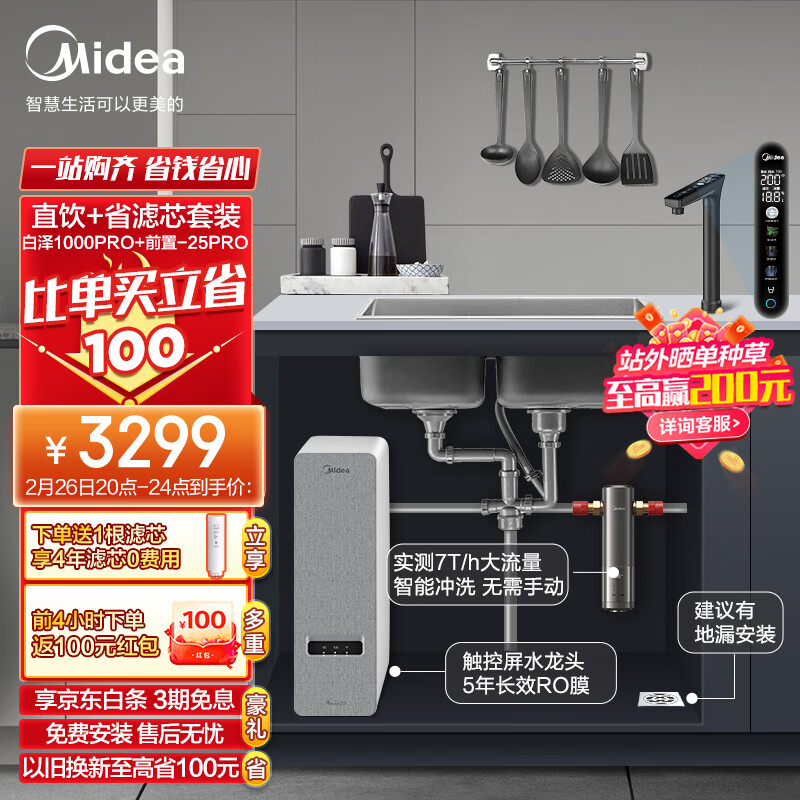 美的(Midea)省芯直饮净水器套装【白泽1000Gpro+前置过滤器-25pro】厨下式智能水龙头 RO反渗透家用一体净饮机价格:3299.00元!