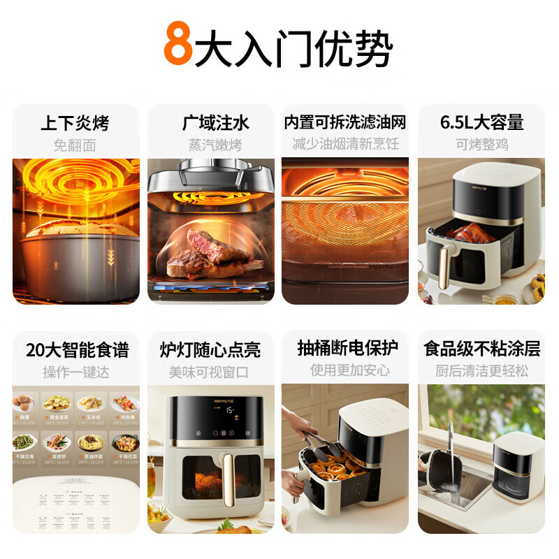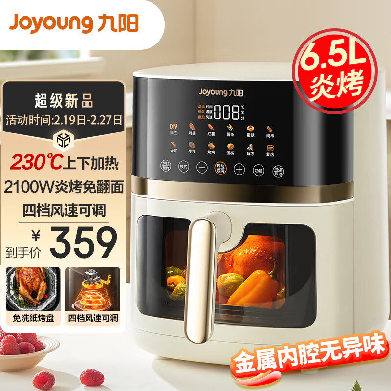 九阳(Joyoung)空气炸锅 炎烤 不用翻面 双热源上下加热 家用6.5L大容量多功能 全息触控 无油低脂煎炸KL65-V573价格:359.00元!
