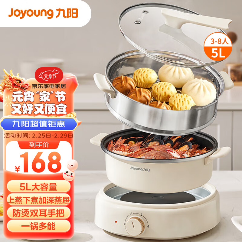 九阳(Joyoung)电火锅家用电蒸锅大功率上蒸下煮分体式涮肉火锅大火力多功能不粘5L升大容量电煮锅 蒸屉款G525S价格:167.90元!
