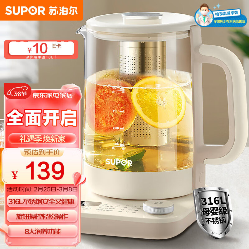 苏泊尔(SUPOR)1.5L大容量养生壶 煮茶器煮茶壶 316L不锈钢电水壶 保温恒温花茶壶烧水壶 旋控 带滤网 SW-15YT12价格:139.00元!