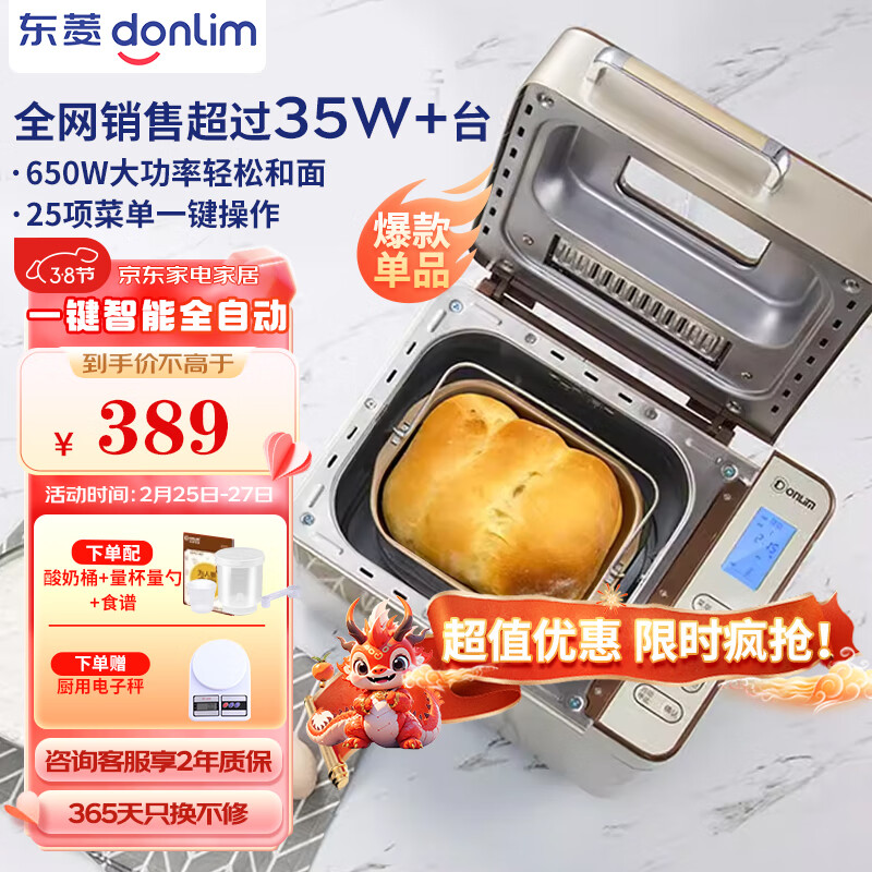 东菱Donlim 面包机 全自动 和面机 家用 揉面机 可预约智能投撒果料烤面包机DL-TM018价格:389.00元!