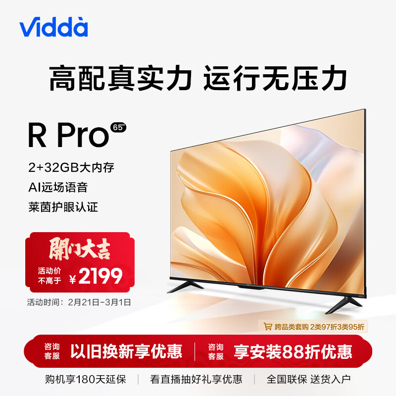 Vidda 海信 R65 Pro 65英寸 超高清 超薄屏电视 智慧屏 2+32G 游戏液晶巨幕电视以旧换新65V1K-R价格:2199.00元!