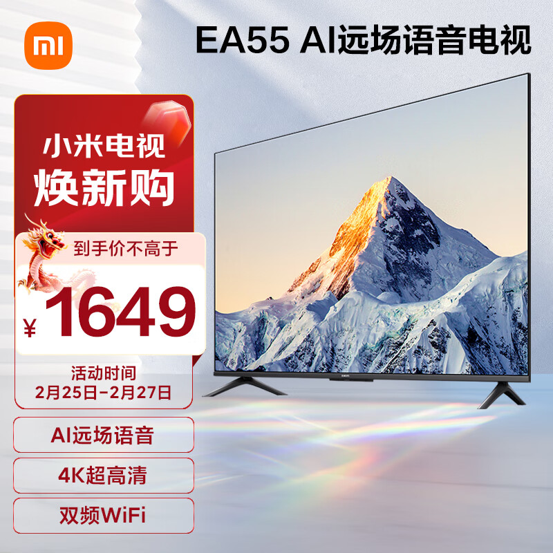 小米电视EA55 55英寸 金属屏 远场语音 逐台校准4K超高清智能教育电视机L55MA-EA以旧换新价格:1599.00元!