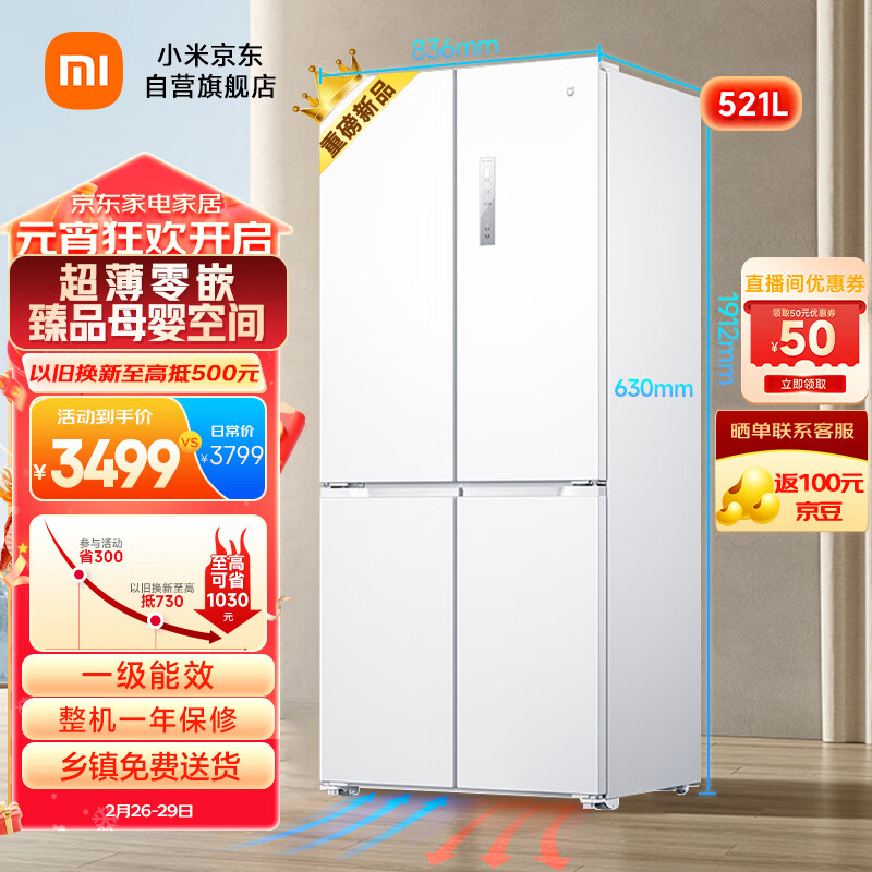 米家小米521升十字对开双开四开门家用电冰箱一级能效白色超薄零嵌入式超大容量底部散热BCD-521WMBI价格:3799.00元!