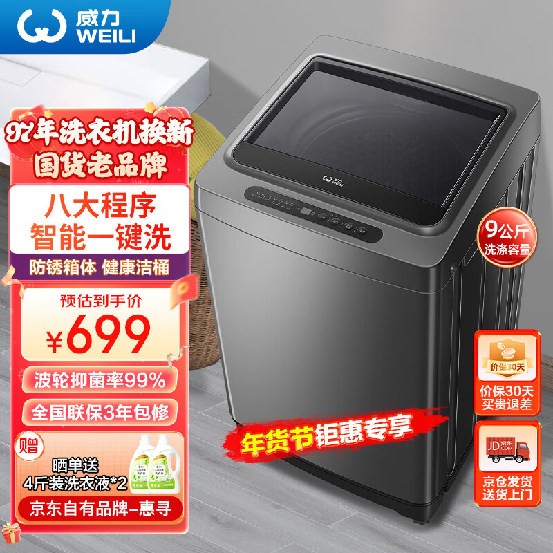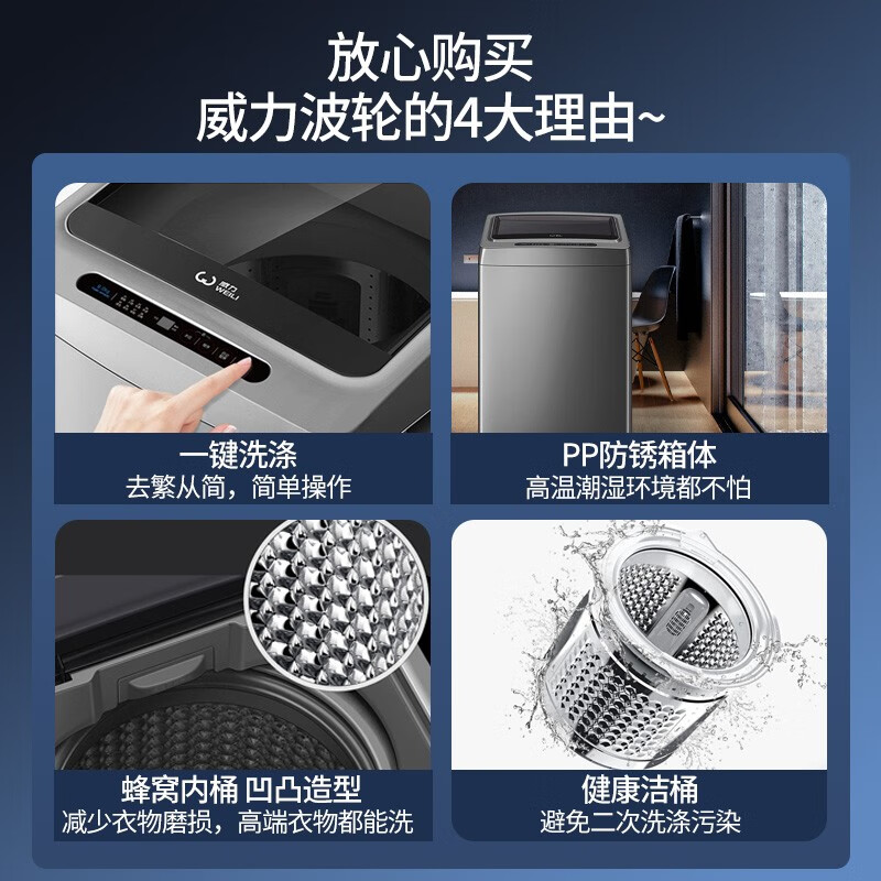 威力(WEILI)9公斤 波轮洗衣机全自动 13分钟一键速洗 量衣判水 防锈箱体护衣内筒(钛金灰)XQB90-1810A价格:699.00元!