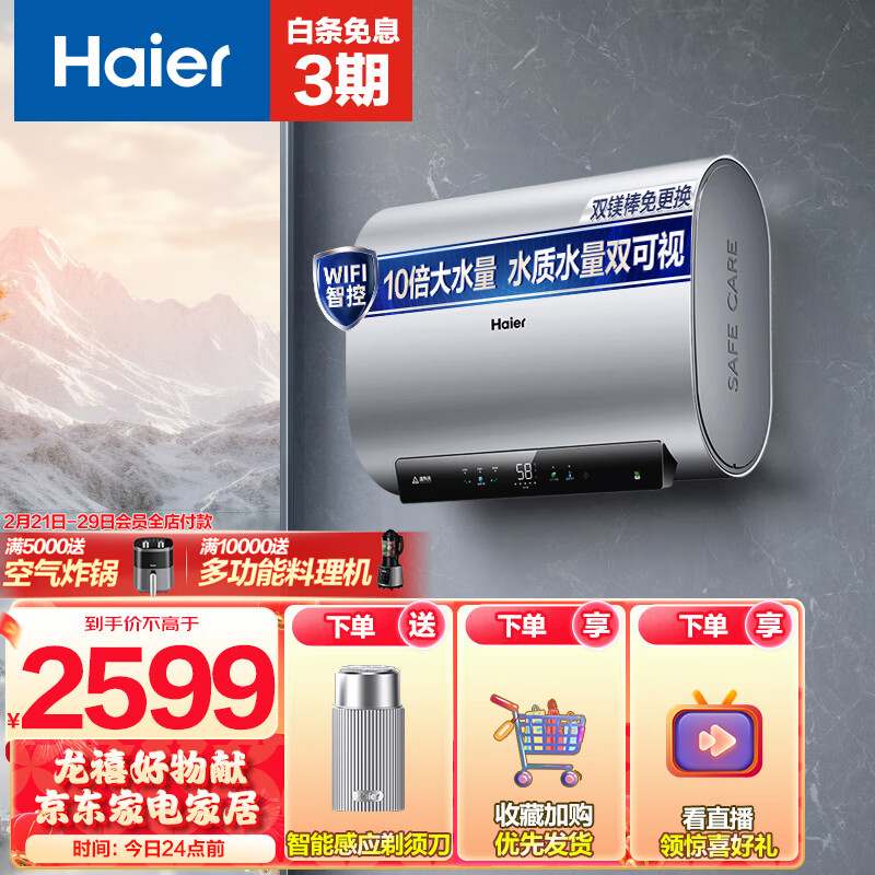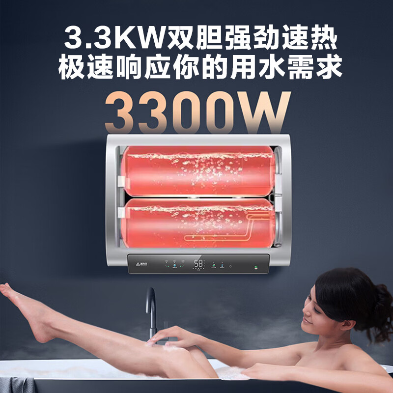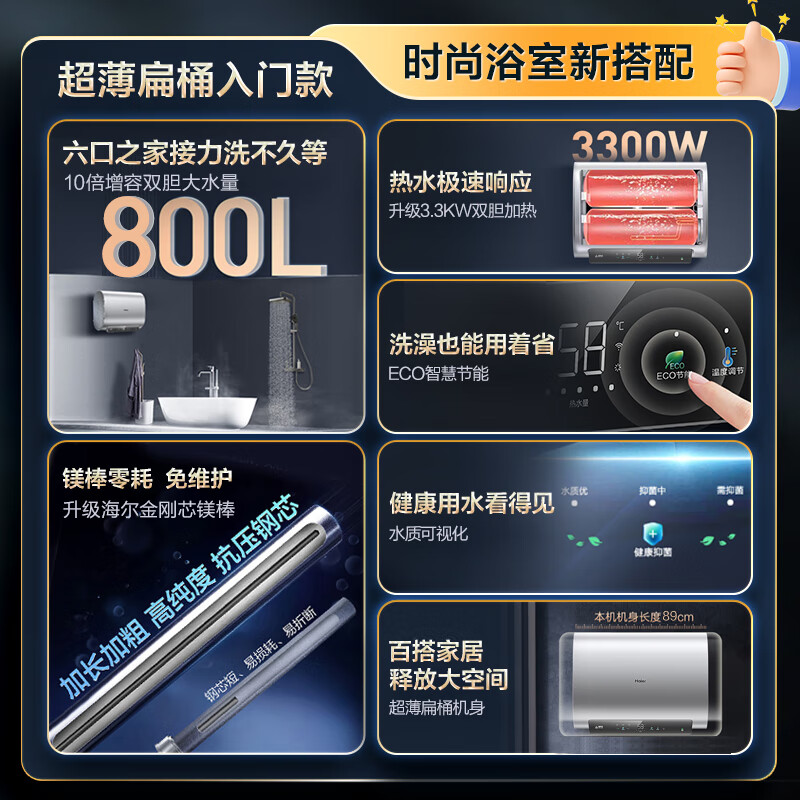 海尔(Haier)80升超薄扁桶双胆电热水器3300W大功率速热大水量一级能效节能 EC8001HD-BK1银U1价格:2799.00元!