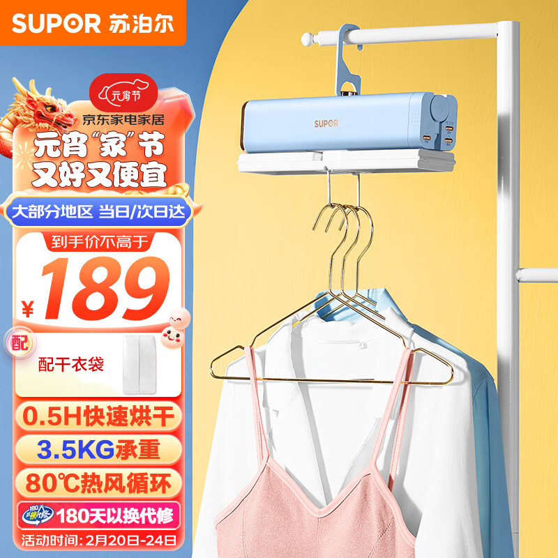 苏泊尔(SUPOR )便携干衣机小型烘衣机家用差旅宿舍干衣神器 快速干衣便携可折叠HG61BX-05浅蓝色价格:189.00元!