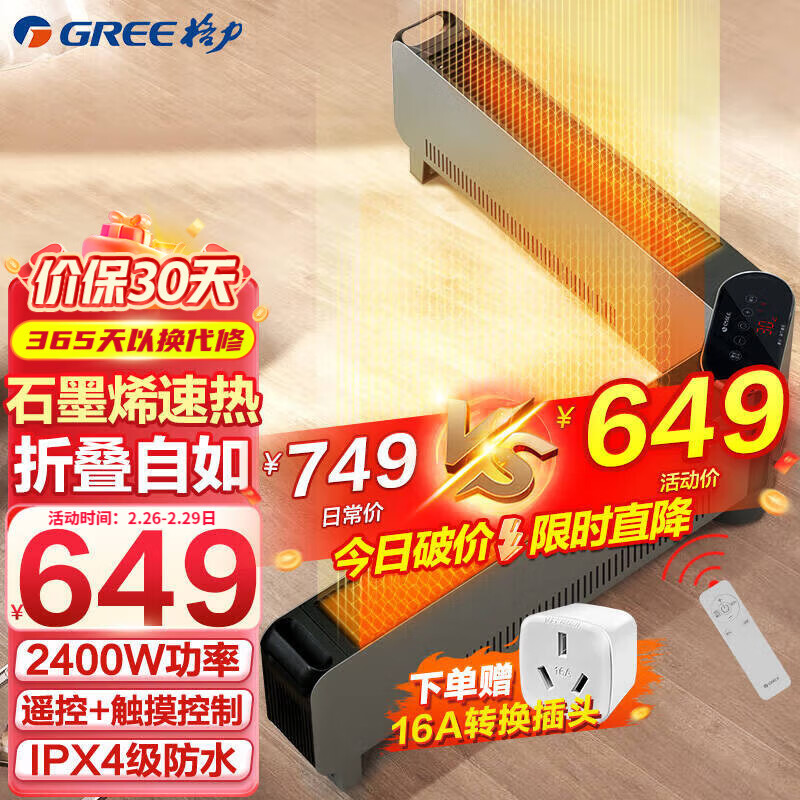 格力(GREE) 石墨烯折叠踢脚线取暖器家用远程遥控IPX4级防水电暖气片家用大面积速热移动地暖风机 1.2米石墨烯2400W款NJE-S6024Ba价格:648.00元!